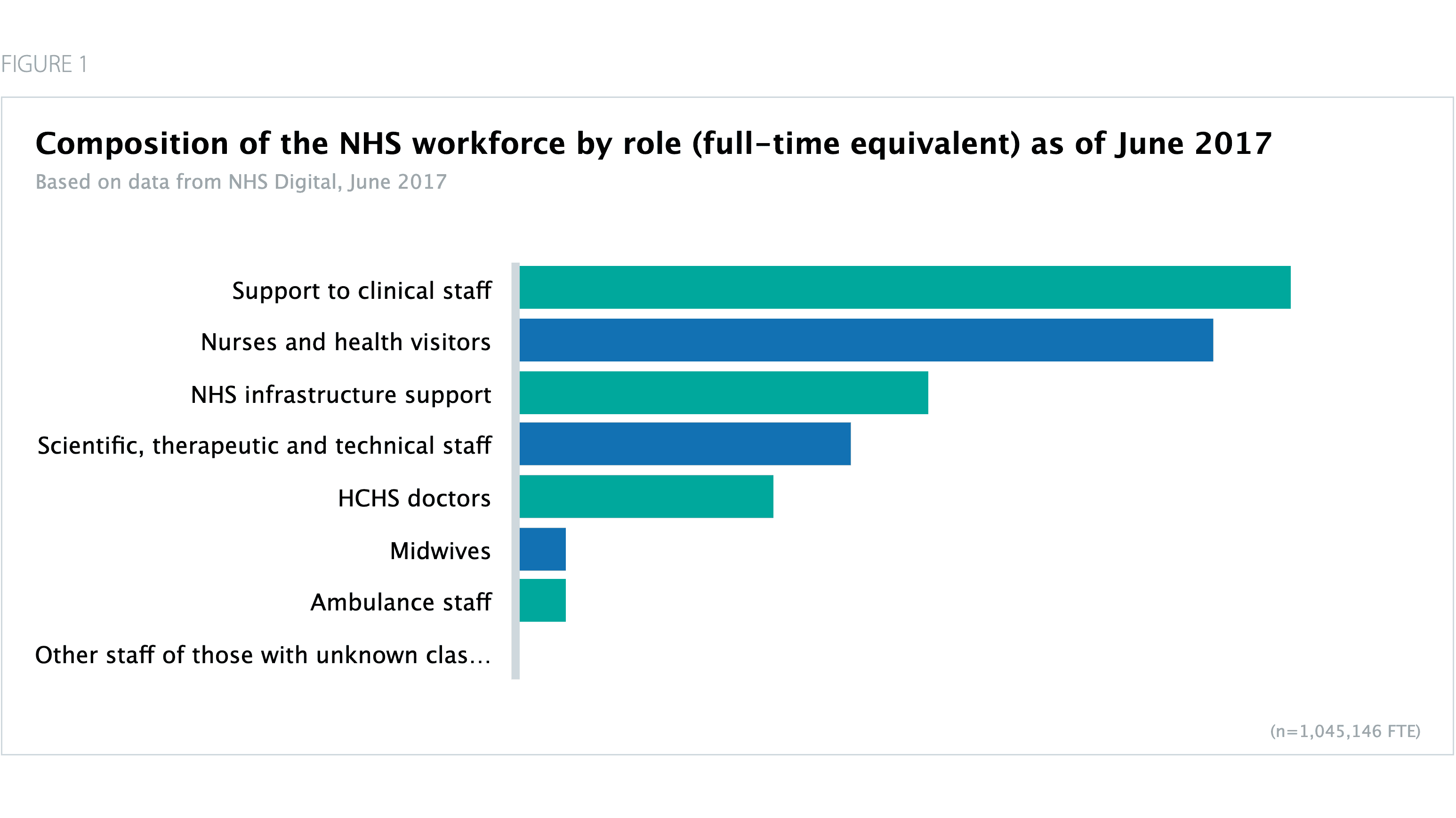 Figure 1 illustrates the role composition of the NHS workforce. Around 54% (564,000) of NHS staff in England today are clinically qualified – nurses /health visitors, scientific, therapeutic, and technical staff, doctors, midwives, and ambulance staff.