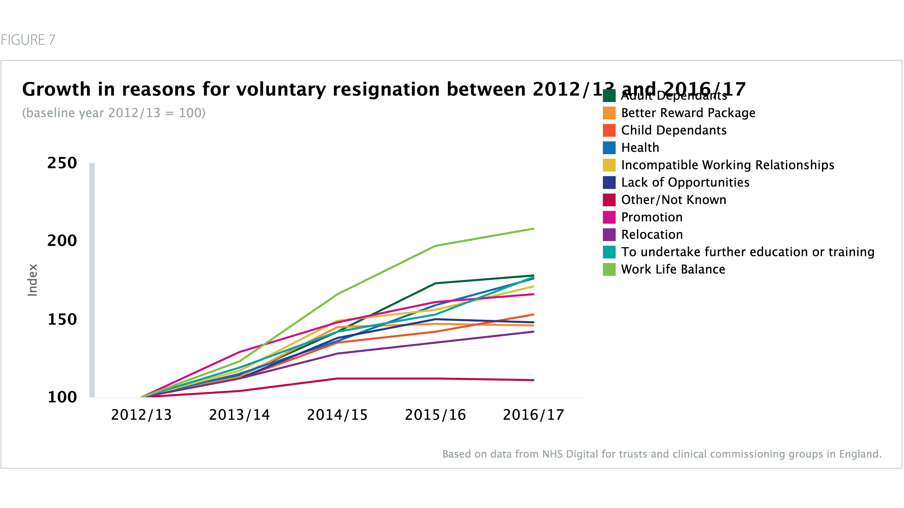 Figure 7 illustrates that work-life balance is now the fastest growing reason for voluntary resignation of NHS staff.