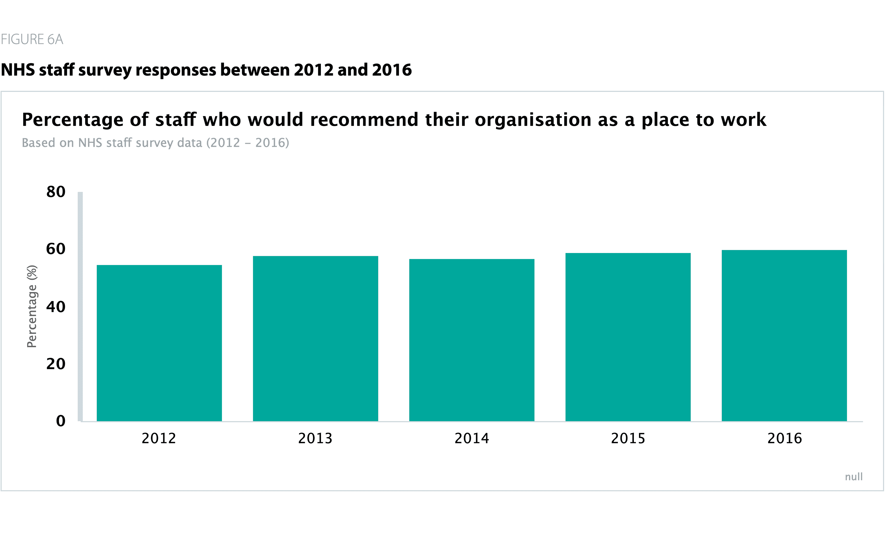 Figure 6 illustrates that the proportion of staff who would recommend their organisation as a place to work has actually increased between 2012 and 2016.