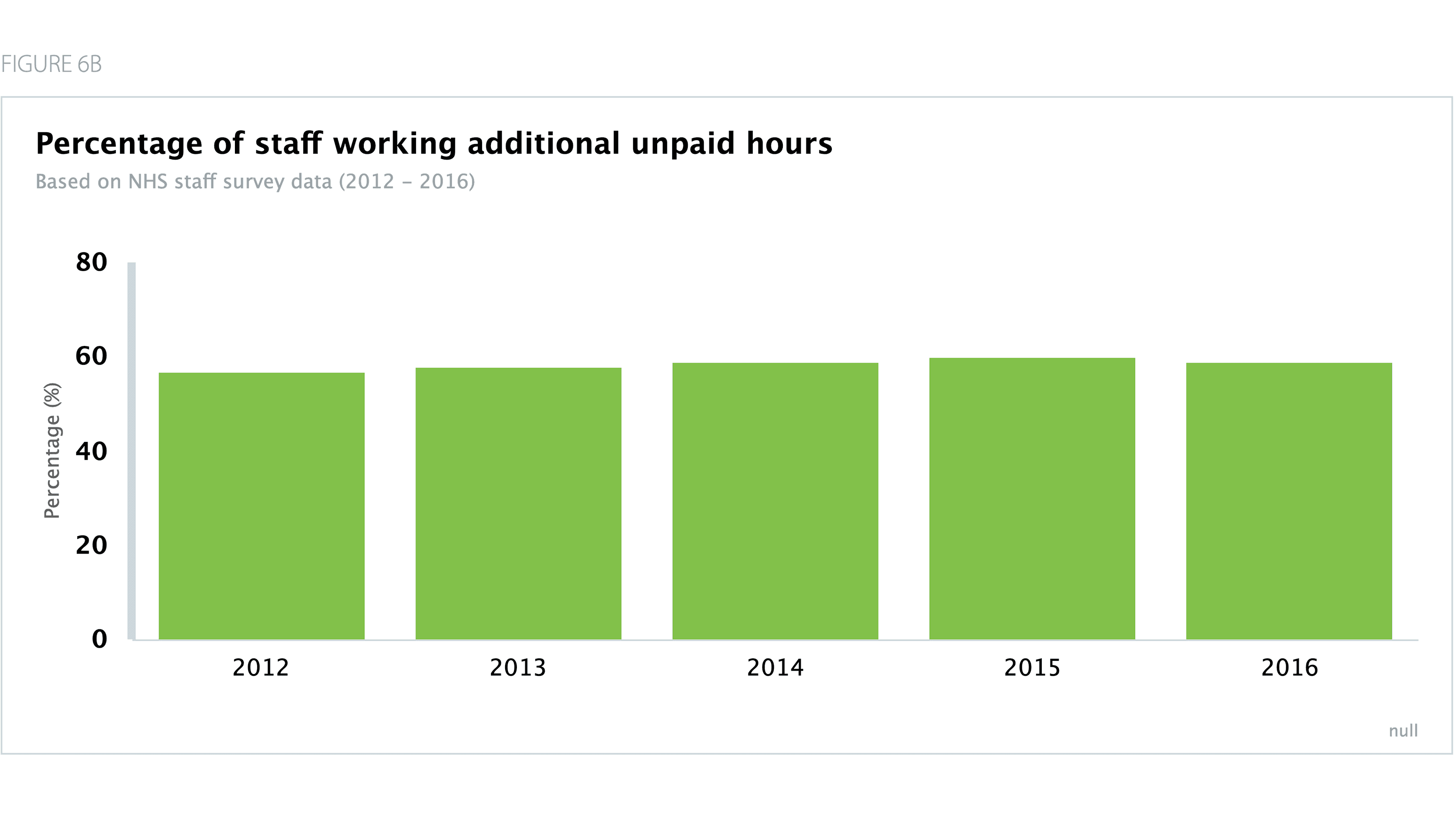 The growth in work-life balance as a reason for leaving the NHS probably reflects the impact of the discretionary effort staff are being asked to put in. This was shown in the 2016 NHS staff survey, illustrated in figure 6 above, where 59% of staff reported working additional unpaid hours, up from 57% in 2012. It may be reasonable to ask staff to occasionally work extra hours, but to ask them to do so regularly as at present is not sustainable. When asked for some of the biggest challenges to recruitment and retention at their trust, 60% of trust chairs and chief executives cited work pressure.
