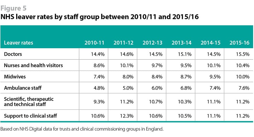 National data shows that across staff groups there is a common trend of rising leaver rates since 2010-11. Figure 5 illustrates the increase for doctors (14.4% to 15.5%), nurses and health visitors (8.6% to 10.4%), midwives (7.4% to 10.0%), ambulance staff (4.8% to 7.6%), support to clinical staff (10.6% to 11.2%), and scientific, therapeutic, and technical staff (9.3% to 11.2%).