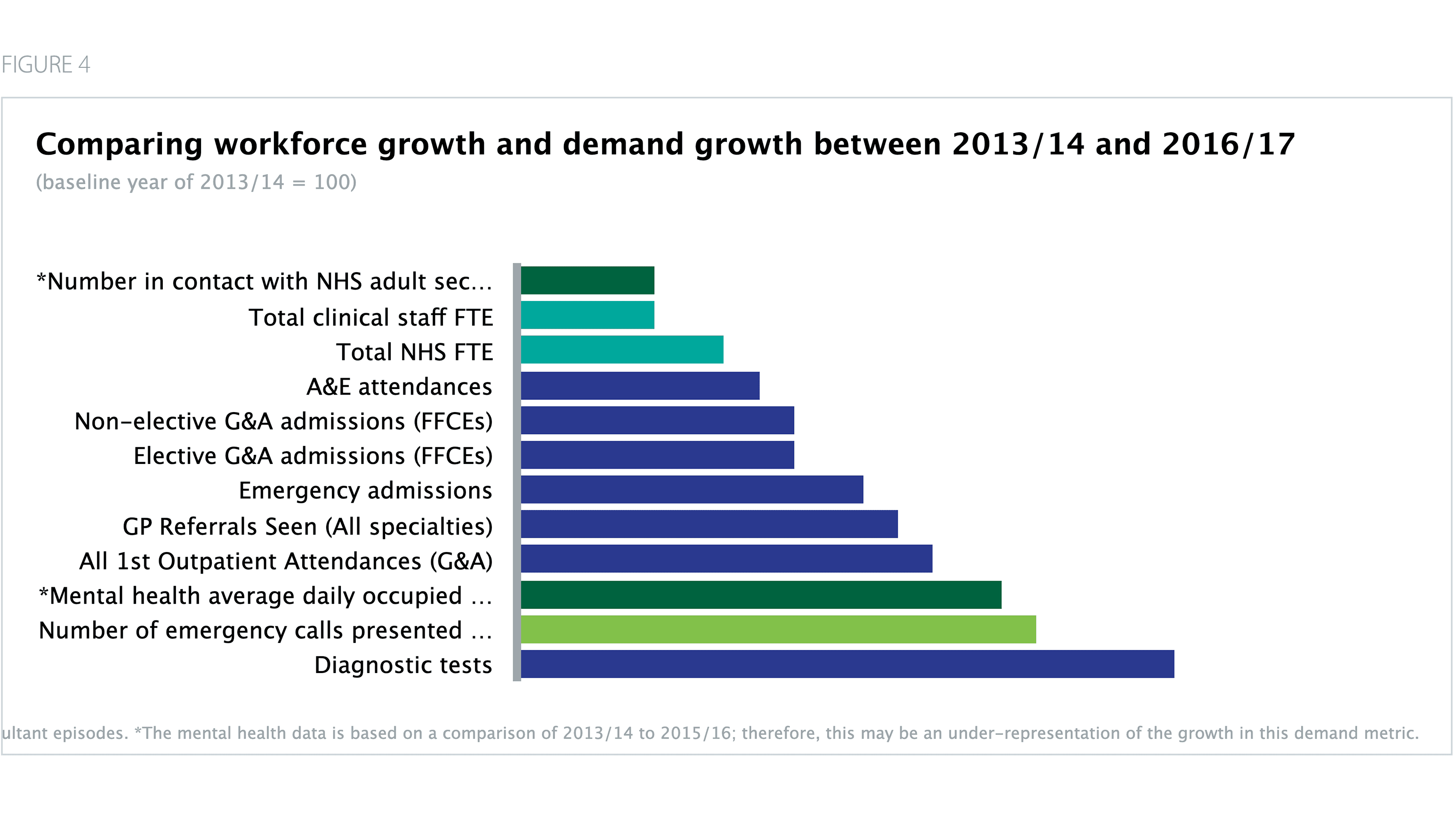 The NHS has more clinical staff, overall, than ever before. Since 2010 there has been an increase in the number of staff (The King's Fund) in all groups except managers and backroom support staff. But the fact is, as figure 4 illustrates, staff numbers have not kept pace with rising demand for services. Increased patient acuity is also a factor. And, crucially, following high-profile failures of care there has been a push for higher staffing levels and a corresponding regulatory focus and rapid rise in demand for nurses from provider trusts (NHS Improvement).