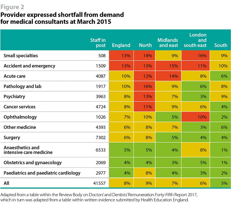 It is clear that the north and, to a lesser extent, east and midlands, are generally faced with higher shortfalls than London and the south east and the south. There are well known shortfalls of accident and emergency consultants across all regions of the country and, outside of London, shortfalls in psychiatry. Notable shortfalls are also found in acute care, pathology, cancer services, ophthalmology, and within the small specialties taken as a whole.